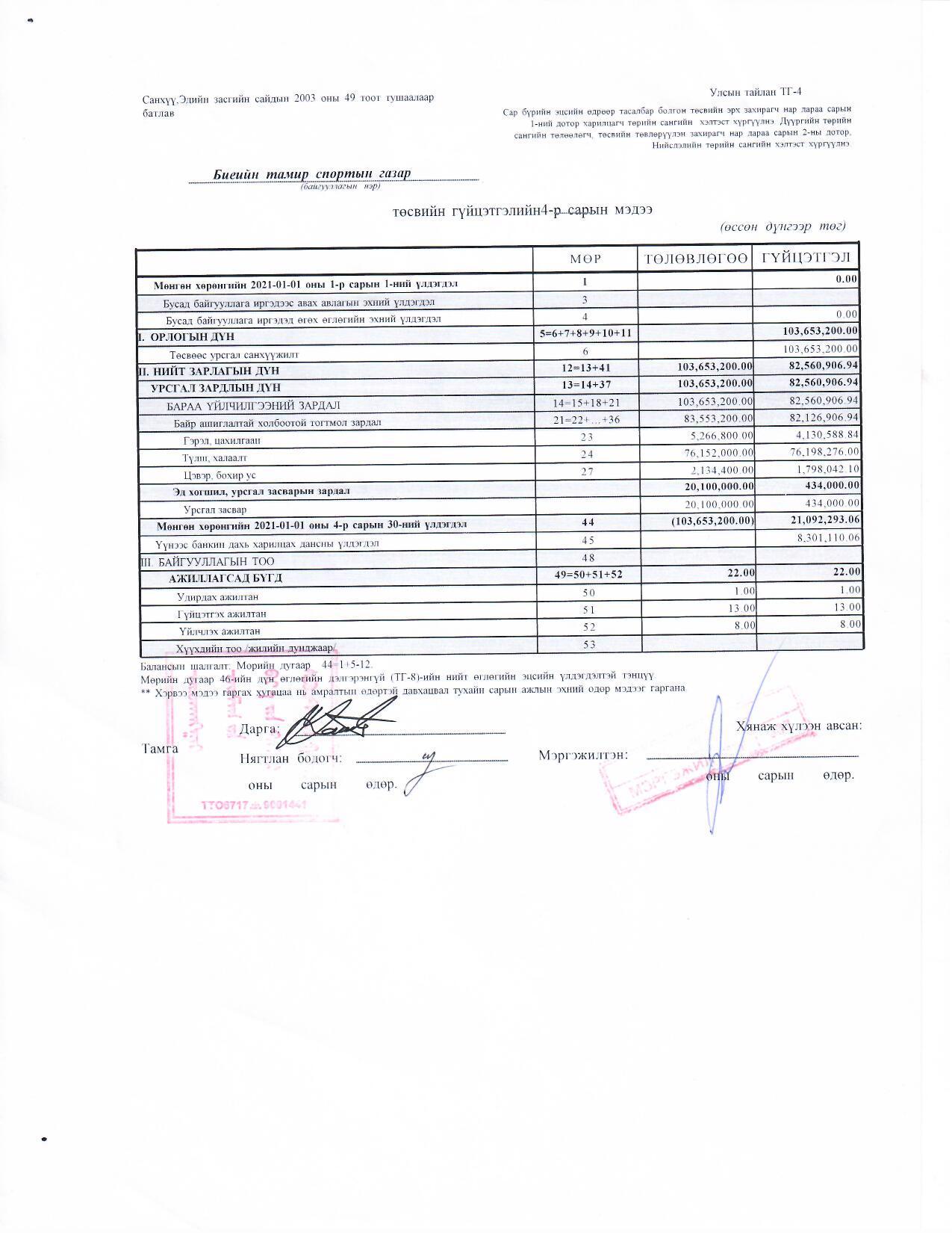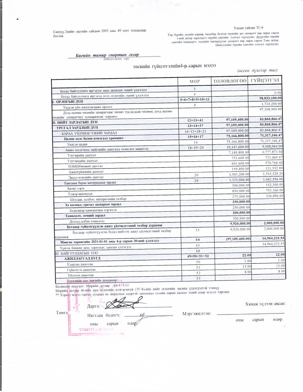 2021 оны 4-р сарын төсөв санхүү